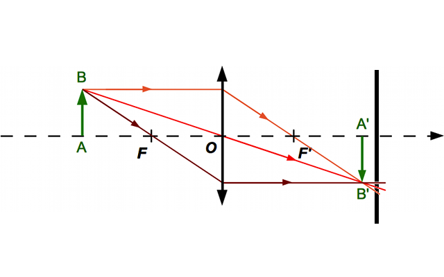 Ici, p est position de l'objet par rapport au centre optique et p' la position de l'image par rapport au même point. F est donc la distance focale. Lorsqu'une image traverse une lentille convergente, on constate un phénomène de réfraction. On peut retenir trois rayons lumineux provenant de l'objet qui prennent des directions précises : le premier passe par le centre optique, un autre passe par le premier foyer et après avoir traversé la lentille continue parallèlement à l'axe optique. Le dernier au contraire commence parallèlement à l'axe optique puis est dévié par la lentille pour passer par le deuxième foyer. Tout les rayons partant de l'objet vont se croiser au même endroit, :